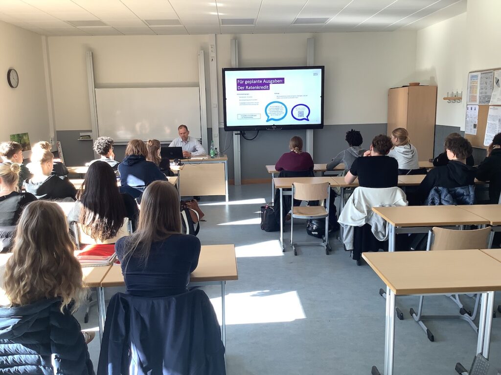 Am 06. März sah der Mathe-Unterricht der 10fs1 einmal anders aus als üblich. Zum Abschluss der Unterrichtseinheit „Exponentielle Zusammenhänge“ besuchte Herr Augustin von der Deutschen Bank die Klasse im Unterricht. Nachdem zuvor im Unterricht Zinsen, Zinssätze, Zinseszinsen und viele andere Dinge berechnet wurden, sollte es für die Schülerinnen und Schüler nun ganz konkret und praxisnäher werden: Wieso nimmt oder gibt die Bank eigentlich Zinsen? Welche Kreditarten gibt es? Wann lohnt sich ein Kredit wirklich? Worin besteht der Unterschied zwischen dem Sparen von Geld und dem Anlegen von Geld? Welche Arten der Geldanlage gibt es? Wie viel Geld hätte ich heute, wenn meine Eltern bei meiner Geburt den Betrag xy auf diese oder jene Art angelegt hätten? Wie teuer ist beispielsweise ein Auto für mich wirklich, wenn ich dafür einen Kredit zu einem bestimmten Zinssatz aufnehmen muss? Der Besuch von Herrn Augustin fand im Rahmen des Projektes https://so-geht-geld.eu/ statt, welches das Ziel der Finanzbildung an Schulen verfolgt. Die Rückmeldungen der Schülerinnen und Schüler waren positiv, der Besuch von Herrn Augustin wurden als sehr sinnvoll und eine Bereicherung für den Mathe-Unterricht beschrieben. Das schreit nach einer Wiederholung! In diesem Sinne noch einmal vielen Dank an Herrn Augustin für den Besuch an unserer Schule.