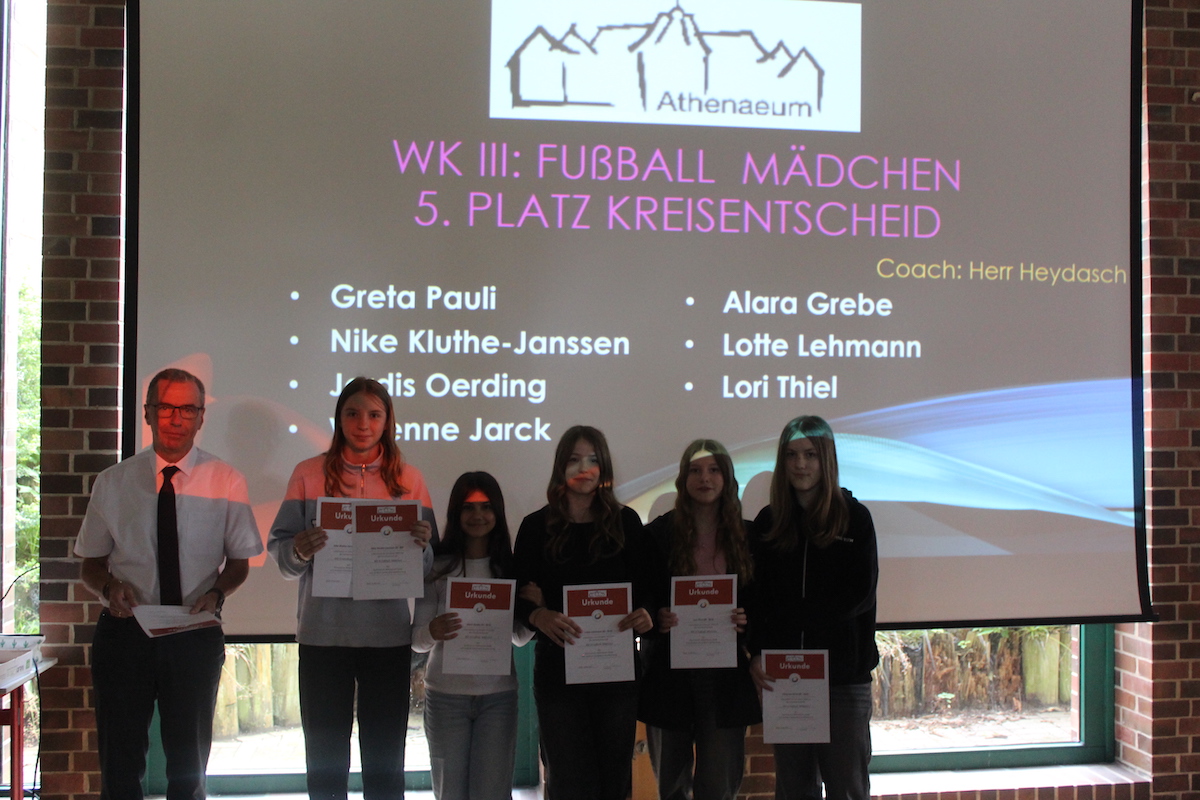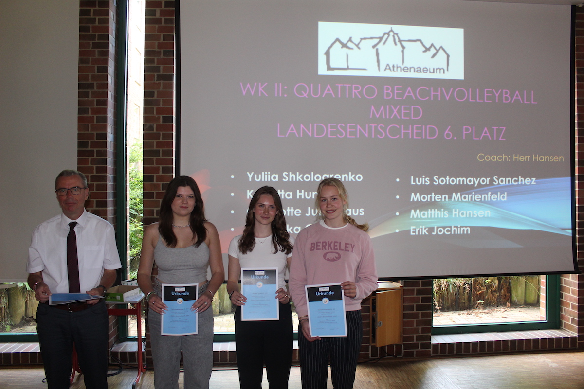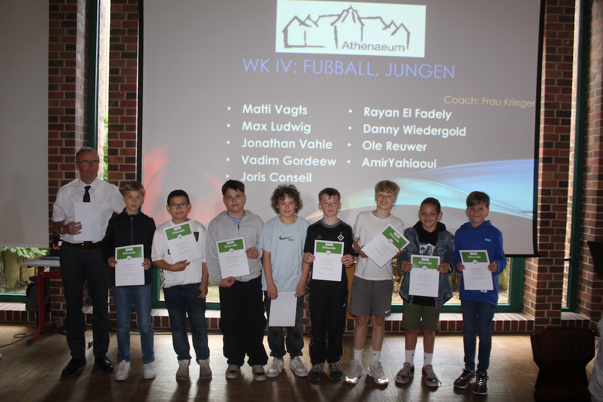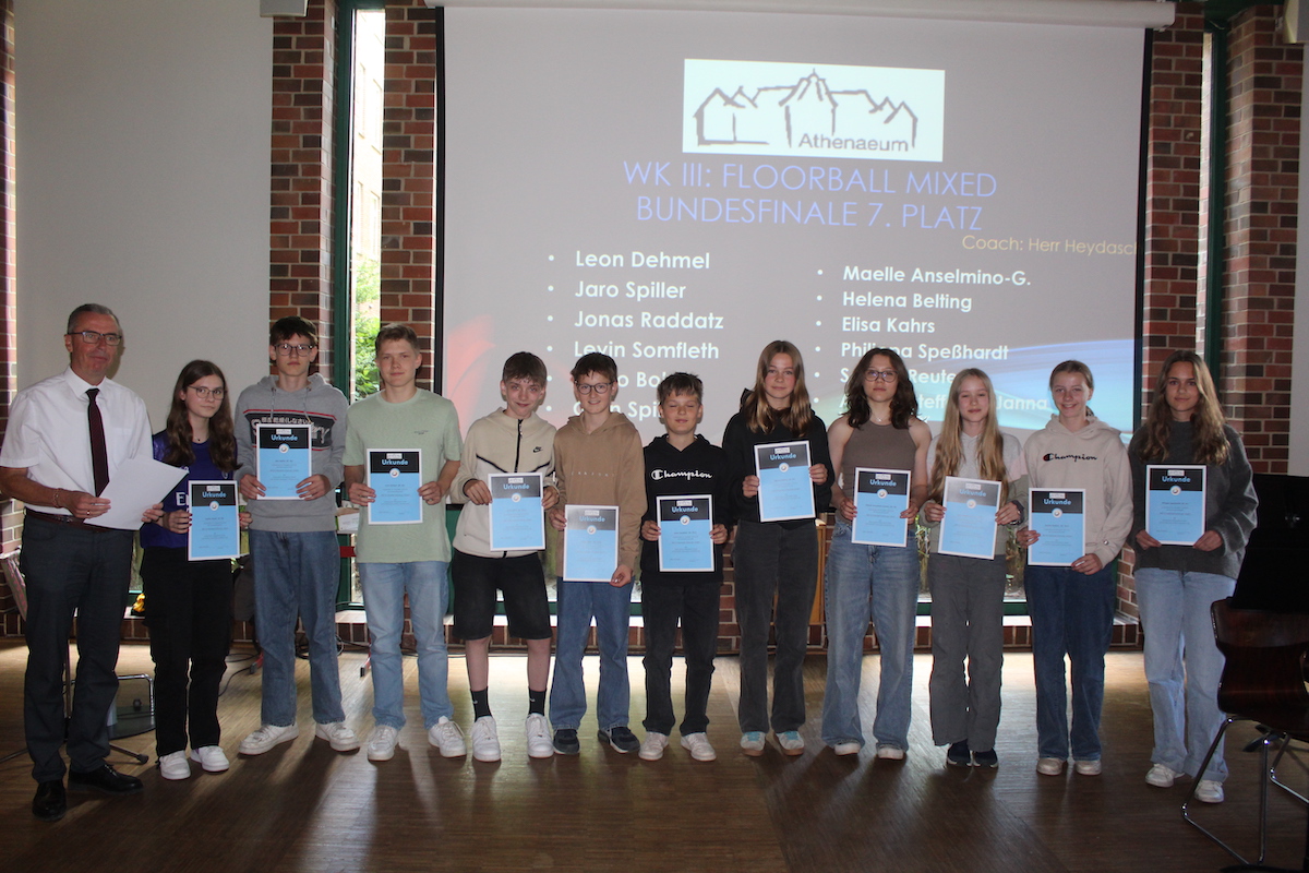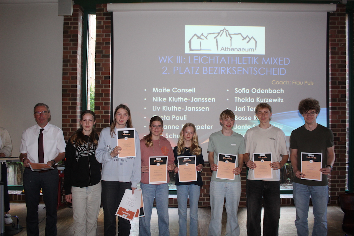 Unsere Schule war auch in diesem Jahr erneut sehr stark vertreten bei der sportlichen Veranstaltung „Jugend trainiert für Olympia“. Vom Fußball bis zur Leichtathletik, das Athe präsentierte sich vielseitig – und erfolgreich. Am 30. Juni 2025 werden alle Athleten, die an einer oder mehreren Sportarten teilgenommen haben, in der Aula von unserem Schulleiter Martin Niestroj geehrt. Die Fachobfrau im Fach Sport, Kristina Puls, hat diese Ehrungen im vergangenen Jahr ins Leben gerufen – und setzt diese nun fort. Weil die Bilder der Veranstaltung aus dem Jahr 2024 bisher noch nicht auf der Homepage erschienen sind, holen wir das an dieser Stelle mit etwas Verzögerung nun nach – und wecken gleichzeitig die Vorfreude auf die kommende Ehrung für alle Athe-Sportler des Jahres 2025. Vielen Dank, ihr habt unsere Schule würdig vertreten und uns im Land ein wenig mehr bekannter gemacht.