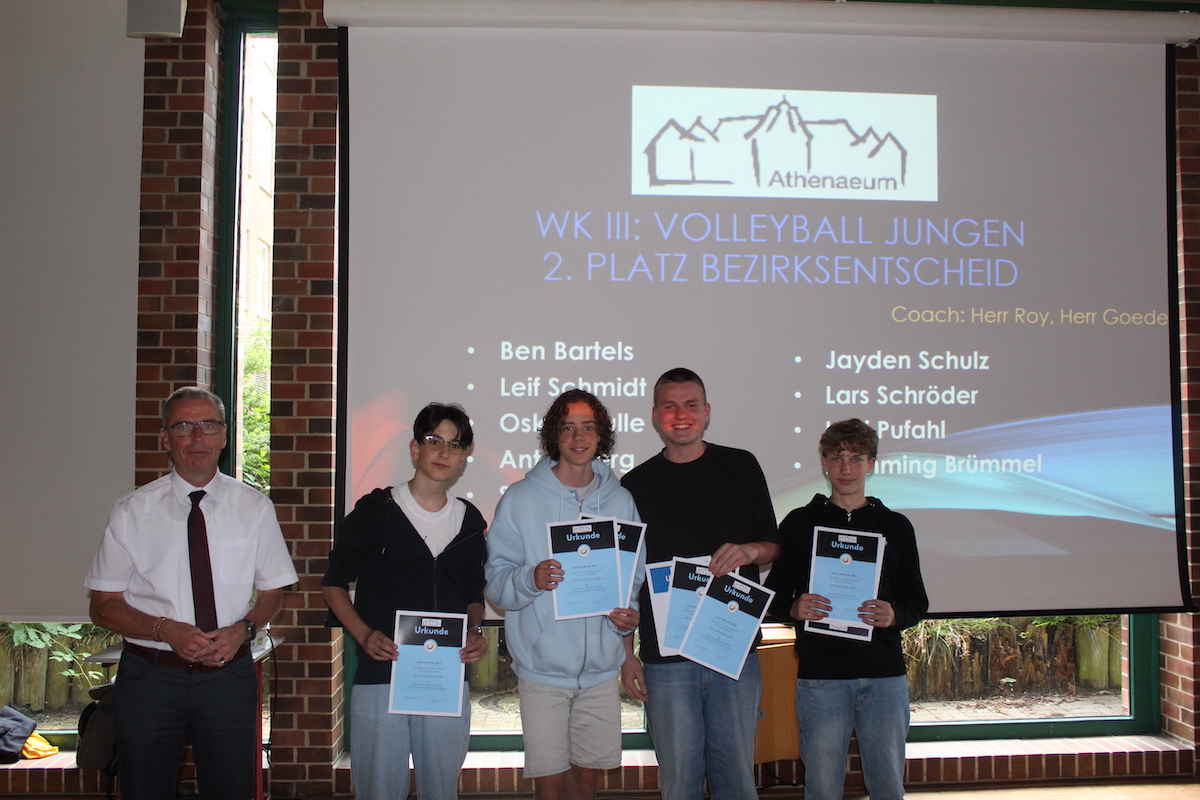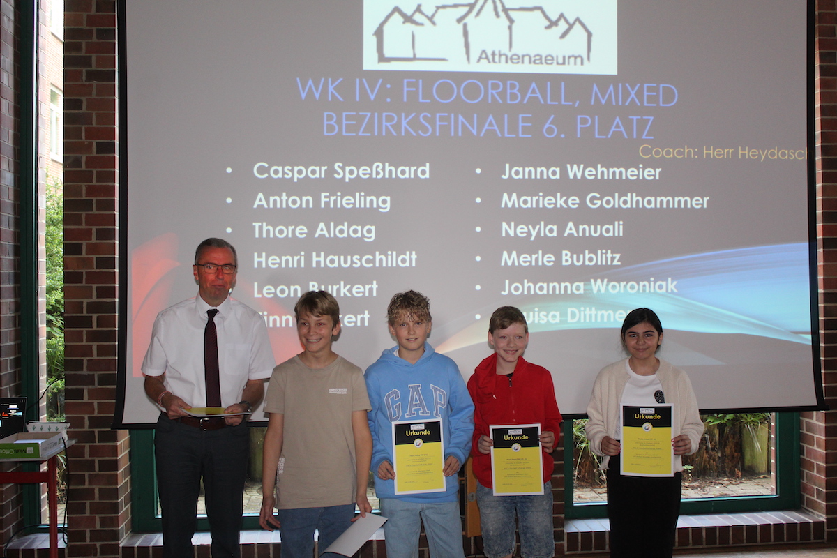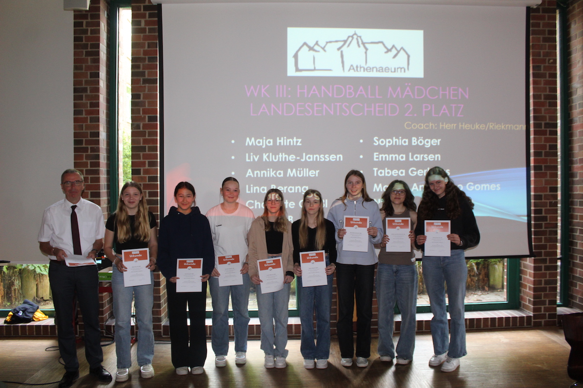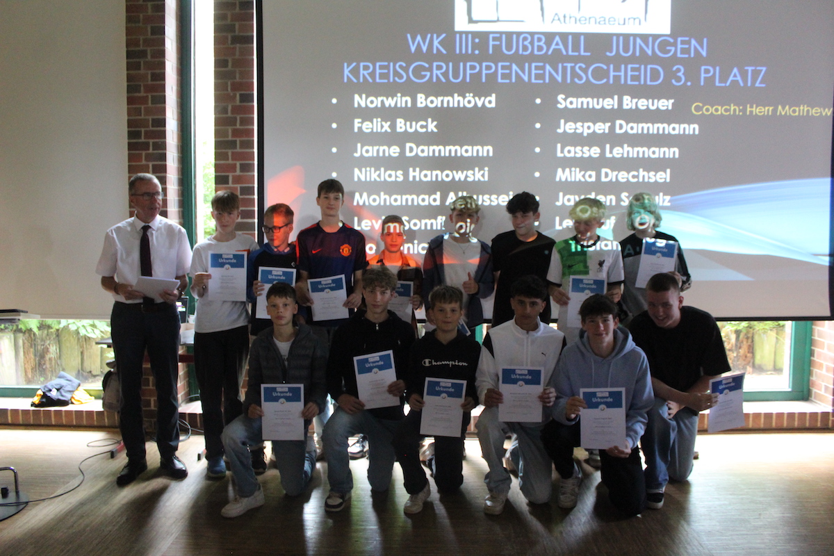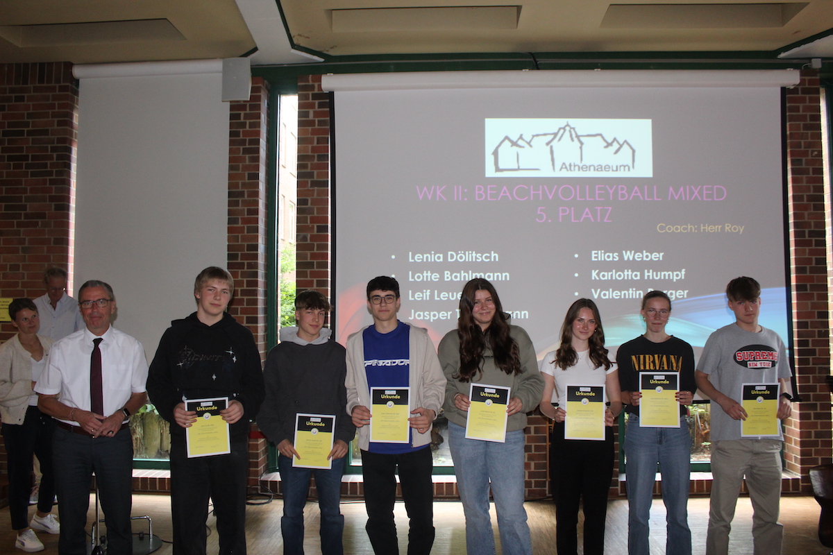 Unsere Schule war auch in diesem Jahr erneut sehr stark vertreten bei der sportlichen Veranstaltung „Jugend trainiert für Olympia“. Vom Fußball bis zur Leichtathletik, das Athe präsentierte sich vielseitig – und erfolgreich. Am 30. Juni 2025 werden alle Athleten, die an einer oder mehreren Sportarten teilgenommen haben, in der Aula von unserem Schulleiter Martin Niestroj geehrt. Die Fachobfrau im Fach Sport, Kristina Puls, hat diese Ehrungen im vergangenen Jahr ins Leben gerufen – und setzt diese nun fort. Weil die Bilder der Veranstaltung aus dem Jahr 2024 bisher noch nicht auf der Homepage erschienen sind, holen wir das an dieser Stelle mit etwas Verzögerung nun nach – und wecken gleichzeitig die Vorfreude auf die kommende Ehrung für alle Athe-Sportler des Jahres 2025. Vielen Dank, ihr habt unsere Schule würdig vertreten und uns im Land ein wenig mehr bekannter gemacht.