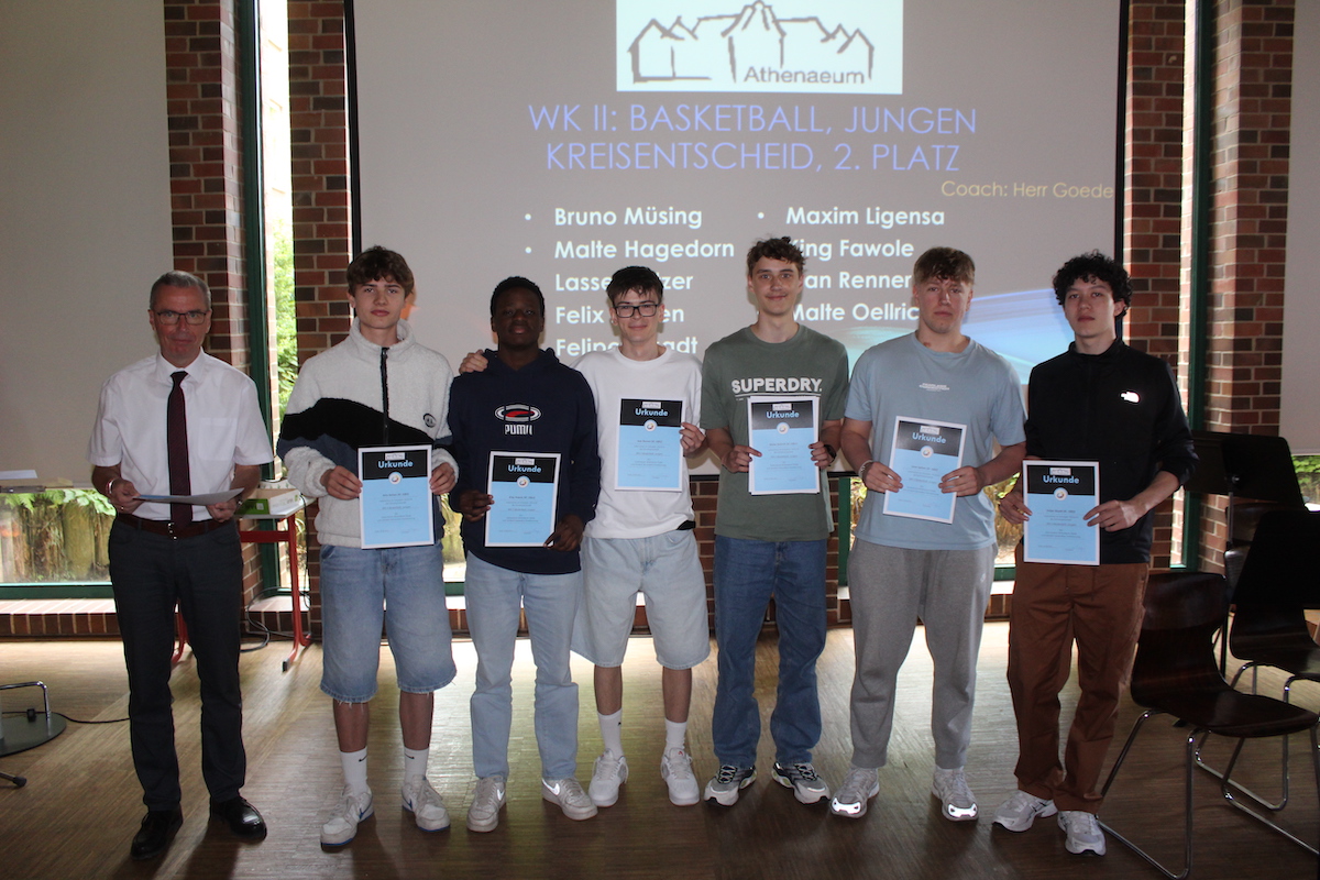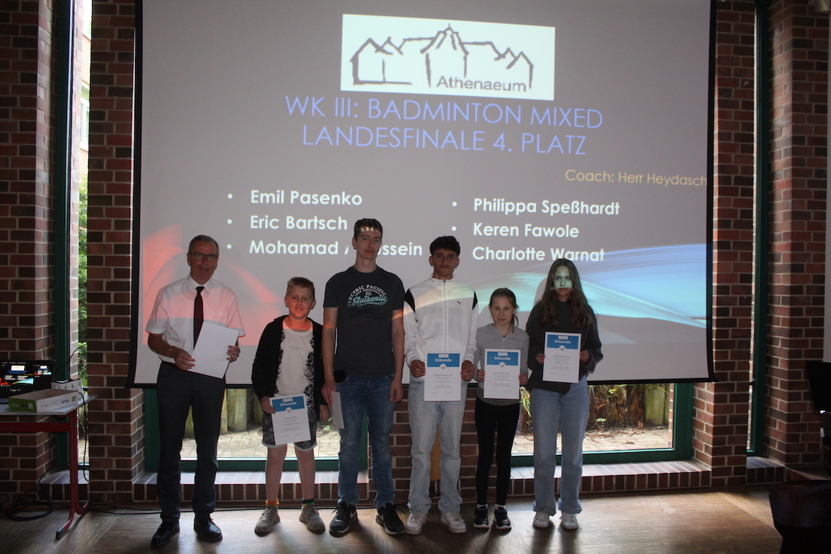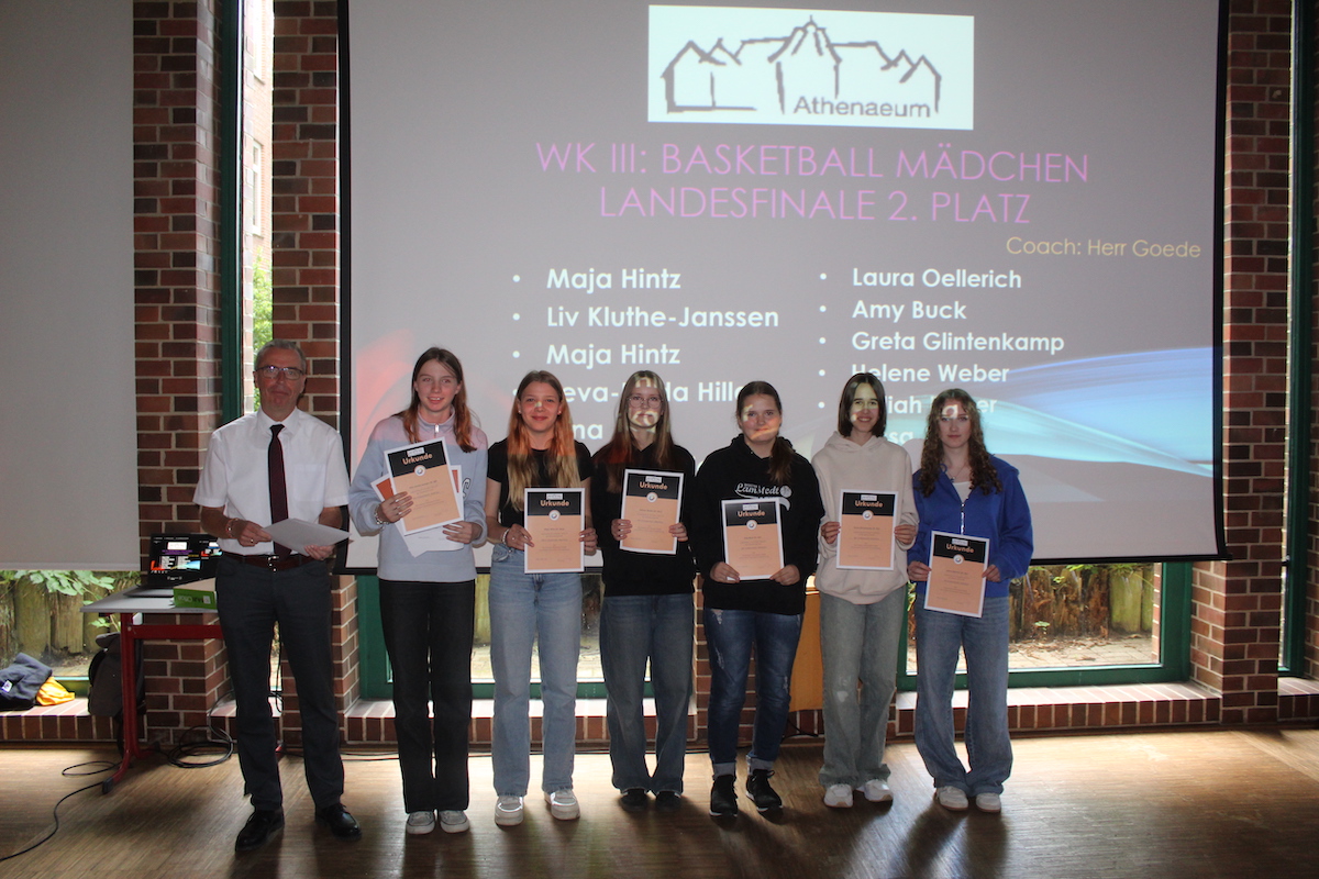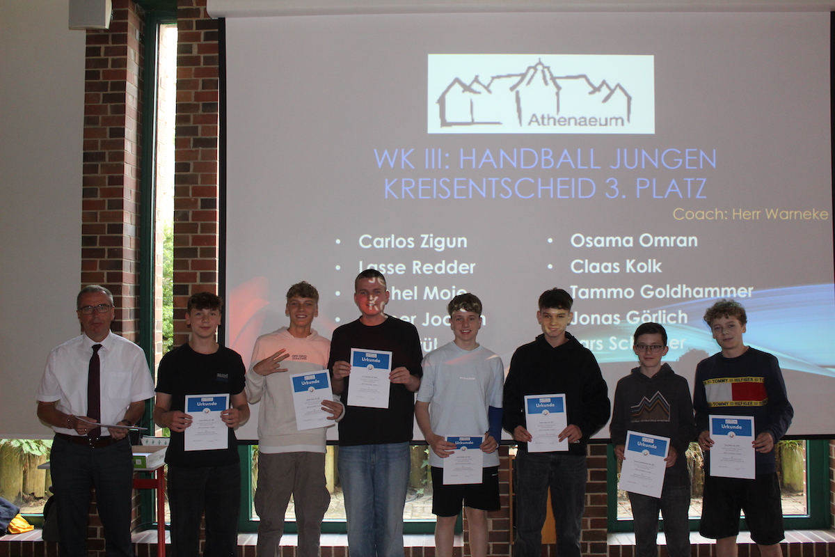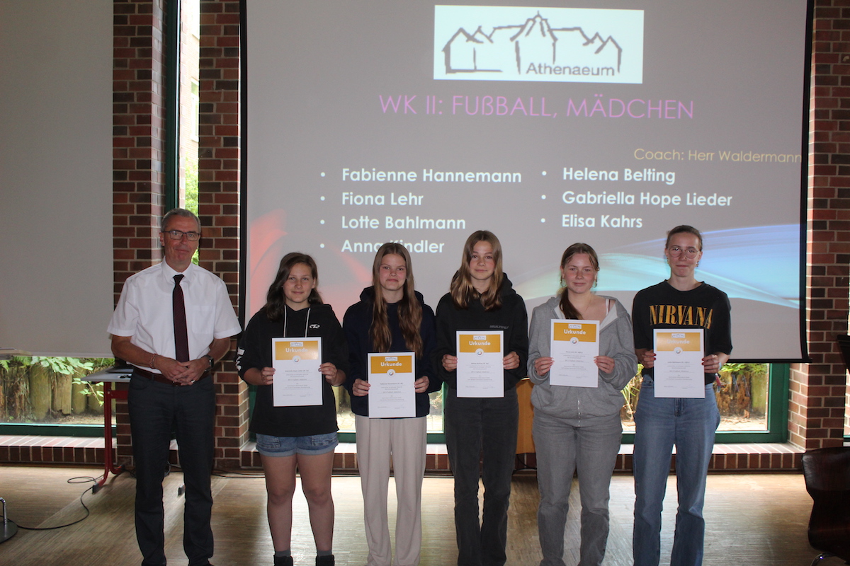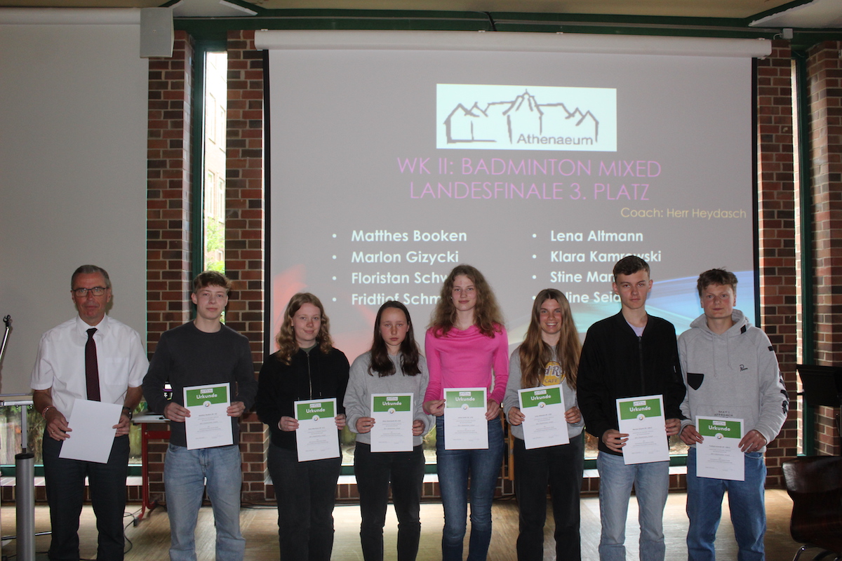 Unsere Schule war auch in diesem Jahr erneut sehr stark vertreten bei der sportlichen Veranstaltung „Jugend trainiert für Olympia“. Vom Fußball bis zur Leichtathletik, das Athe präsentierte sich vielseitig – und erfolgreich. Am 30. Juni 2025 werden alle Athleten, die an einer oder mehreren Sportarten teilgenommen haben, in der Aula von unserem Schulleiter Martin Niestroj geehrt. Die Fachobfrau im Fach Sport, Kristina Puls, hat diese Ehrungen im vergangenen Jahr ins Leben gerufen – und setzt diese nun fort. Weil die Bilder der Veranstaltung aus dem Jahr 2024 bisher noch nicht auf der Homepage erschienen sind, holen wir das an dieser Stelle mit etwas Verzögerung nun nach – und wecken gleichzeitig die Vorfreude auf die kommende Ehrung für alle Athe-Sportler des Jahres 2025. Vielen Dank, ihr habt unsere Schule würdig vertreten und uns im Land ein wenig mehr bekannter gemacht.