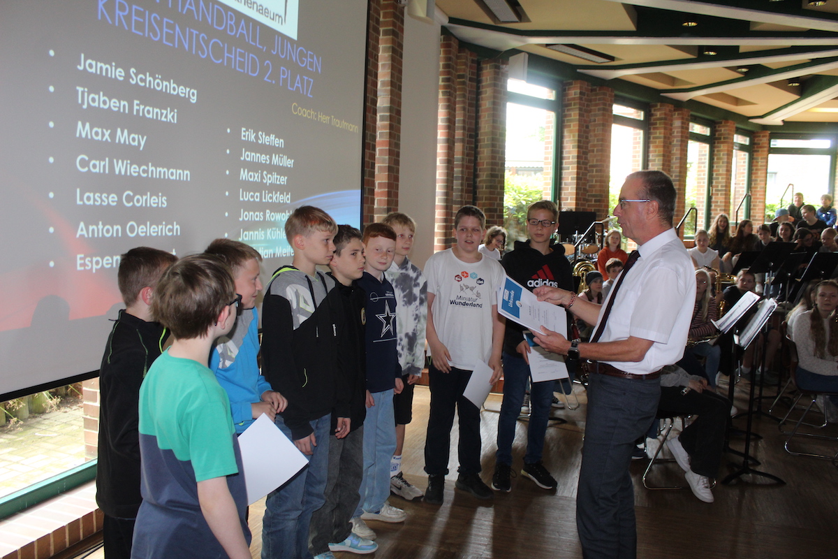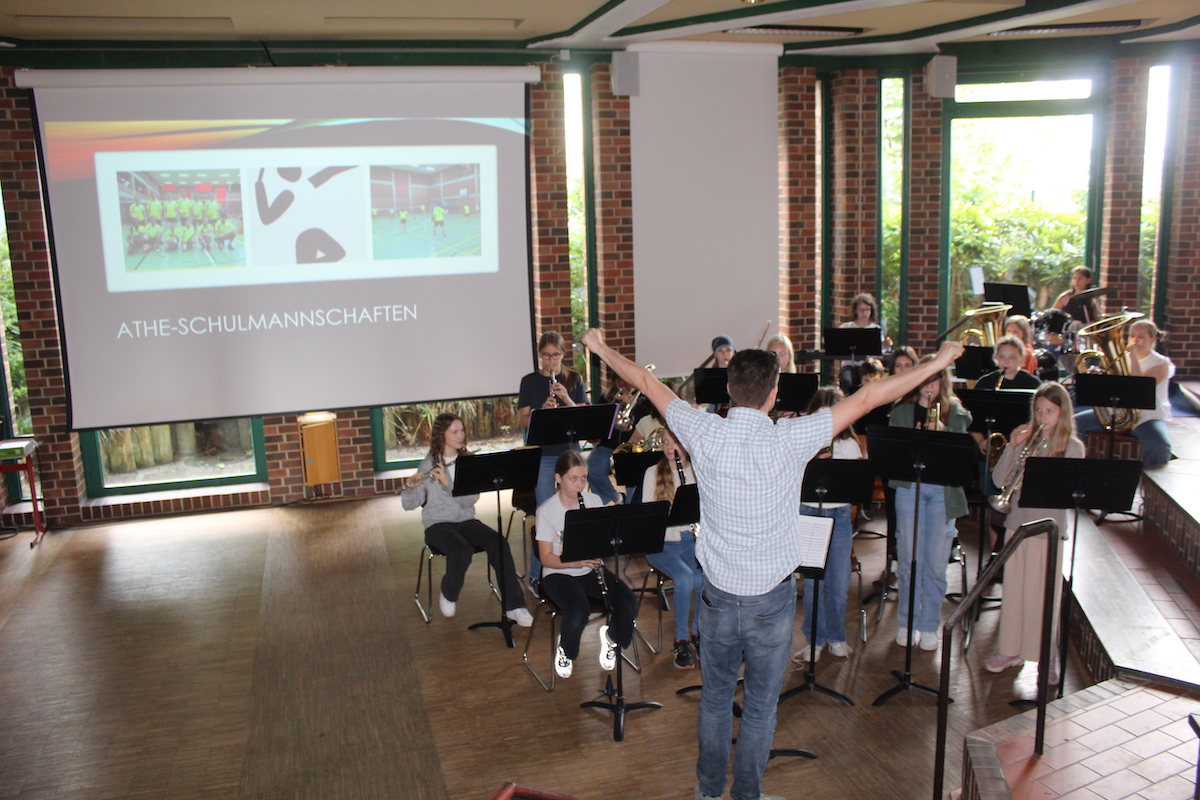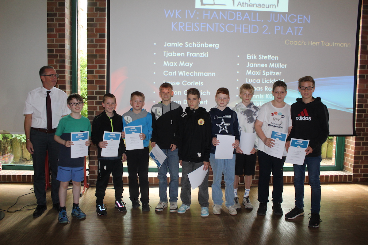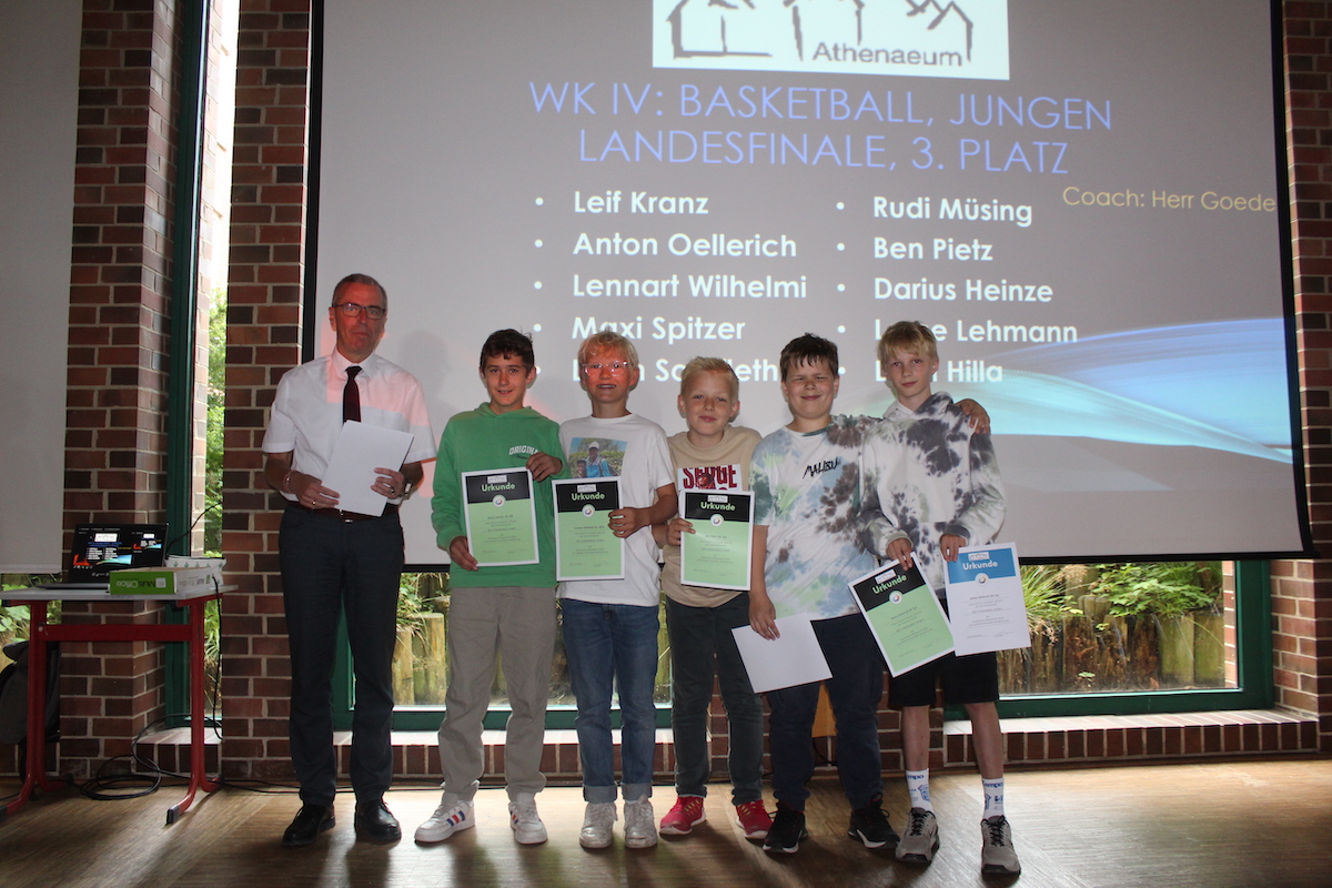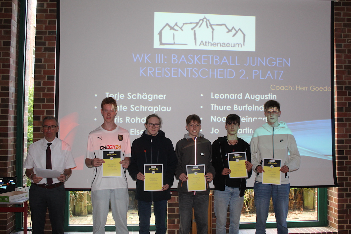 Unsere Schule war auch in diesem Jahr erneut sehr stark vertreten bei der sportlichen Veranstaltung „Jugend trainiert für Olympia“. Vom Fußball bis zur Leichtathletik, das Athe präsentierte sich vielseitig – und erfolgreich. Am 30. Juni 2025 werden alle Athleten, die an einer oder mehreren Sportarten teilgenommen haben, in der Aula von unserem Schulleiter Martin Niestroj geehrt. Die Fachobfrau im Fach Sport, Kristina Puls, hat diese Ehrungen im vergangenen Jahr ins Leben gerufen – und setzt diese nun fort. Weil die Bilder der Veranstaltung aus dem Jahr 2024 bisher noch nicht auf der Homepage erschienen sind, holen wir das an dieser Stelle mit etwas Verzögerung nun nach – und wecken gleichzeitig die Vorfreude auf die kommende Ehrung für alle Athe-Sportler des Jahres 2025. Vielen Dank, ihr habt unsere Schule würdig vertreten und uns im Land ein wenig mehr bekannter gemacht.